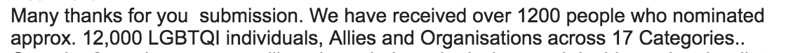 “Hey so got a new email from the LGBTI awards,” a nominee just wrote to me. “Apparently I’m either a finalist for the destination category (according to the email subject) or the hero category – a category I wasn’t nominated for. This thing is weird.”