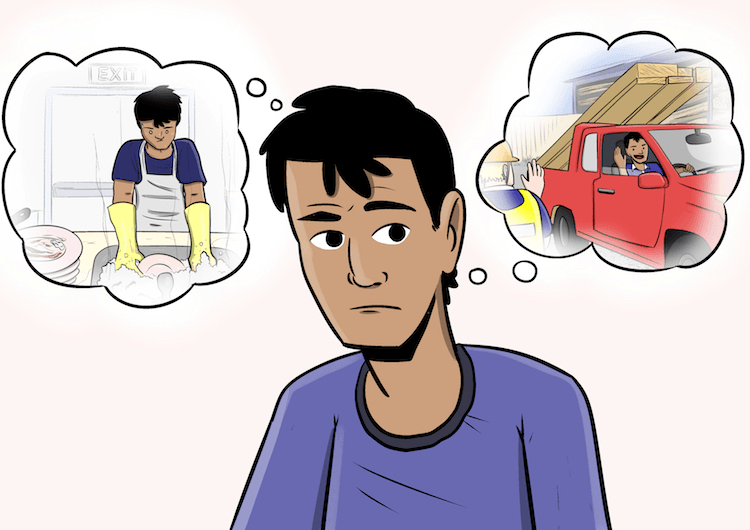 In our story, both Liz and Sam work – most low-income families in New Zealand do. Liz is a healthcare worker and Sam does manual work. In one path we focus on Sam’s struggle to find and retain good work after Liz has a baby.