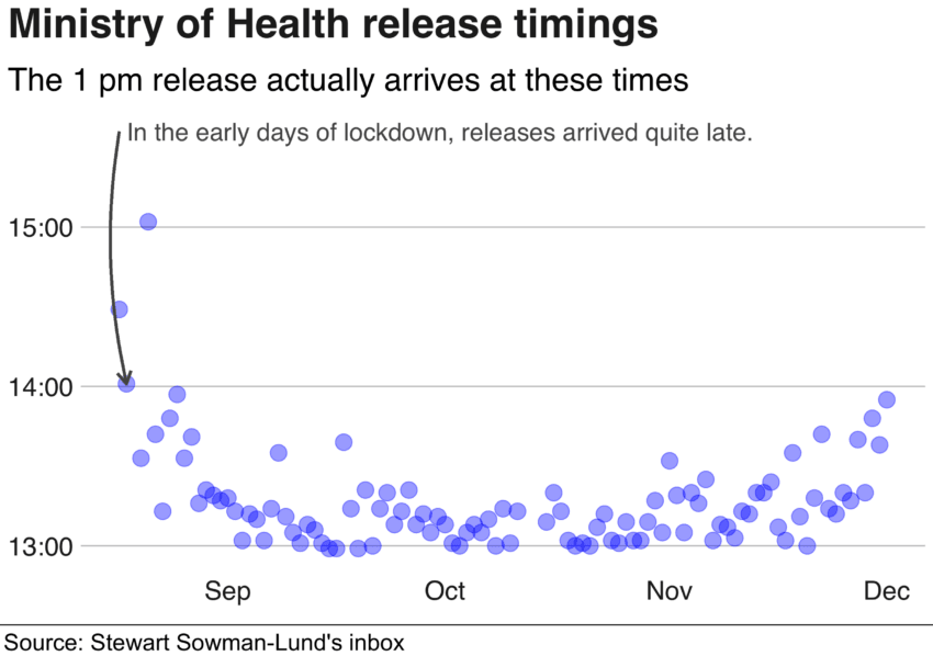 The Spinoff’s data whiz Harkanwal Singh charted every “1pm” press release from August 17 to December 1, and here’s what we found: