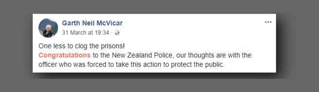 Garth McVicar’s comments regarding the death of a man shot by police on Easter Saturday near Poehuehue – he began with the words “One less to clog the prisons!” – represent the exact antithesis of police values. They are reprehensible to me and my fellow police officers.