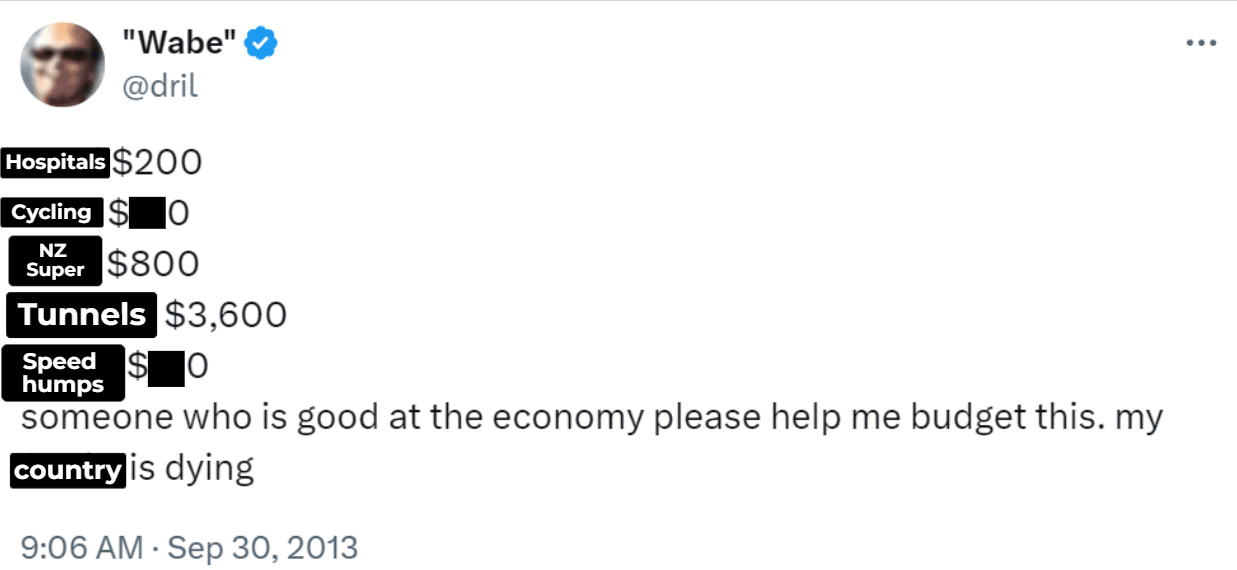 Everyone hated the $785 million bike bridge. Even cyclists would say it was too expensive. Newstalk ZB descended into a multi-week rage-induced fugue state. The airwaves filled up with the sound of sputtering. Meanwhile, David Seymour told the Herald “we’d lose less if Michael Wood sent taxpayers’ money to a Nigerian prince to keep safe until he can pay us back”.