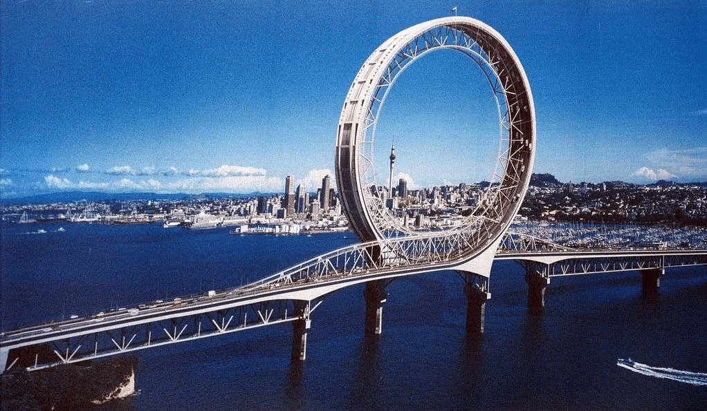 The loop-the-loop is a homage to the circular argument we’ve been having about an additional harbour crossing for several decades, and is approximately as feasible as the double-decker bridge.