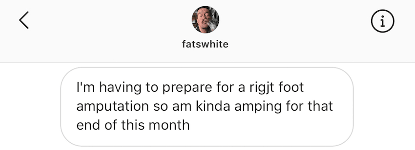 Postscript: Fats wrote with some good news: “I’m not getting it [his foot] removed at this stage, I’m getting a fusion, they said this will take the pain away. The surgeon said if that doesn’t work, they may have to remove it, if things don’t work out.”