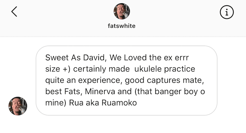It wasn’t an easy message to understand, but Fats White appeared to be a fan of the video I’d posted. I’d also learnt some brand new information – that the dogs were named “Minerva” and “Ruamoko”, or just “Rua”. I assumed that because Ruamoko was referenced as “that banger boy”, he was the one on two legs.