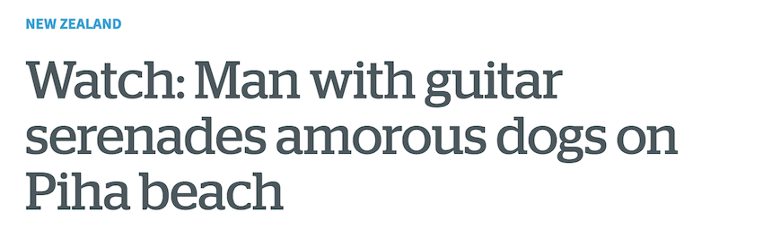Someone had been driving along the road at Piha (over a month on from my incident), looked up, and spotted a man playing a ukulele to two dogs. My source started recording the sight on his phone, and as he filmed one dog mounted the other and the lovemaking began.
