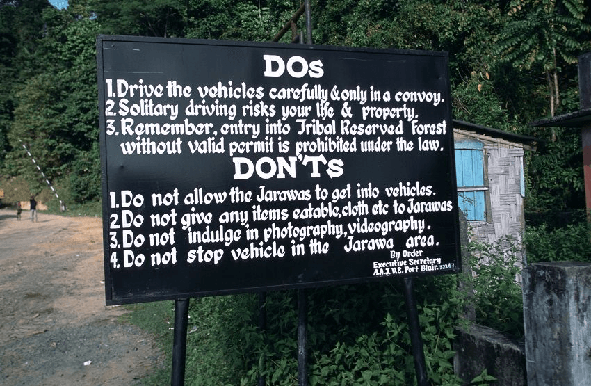 The Jarawa people live in the jungle of South Andaman Island. For centuries they refused all friendly contact with outsiders, preferring to shoot arrows at intruders on their land and to raid the villages on the edge of the forest. In 1996, a Jarawa teenager named Enmei fell out of a fruit tree he’d been robbing in the Indian village of Kadamtala, and broke his leg. Enmei spent six months in the hospital at Port Blair, the capital of the Andamans, where he learned to wear clothes and enjoy television. He went home as an emissary for the Indian authorities and soon persuaded his fellow Jarawa to make peace with the settlers.