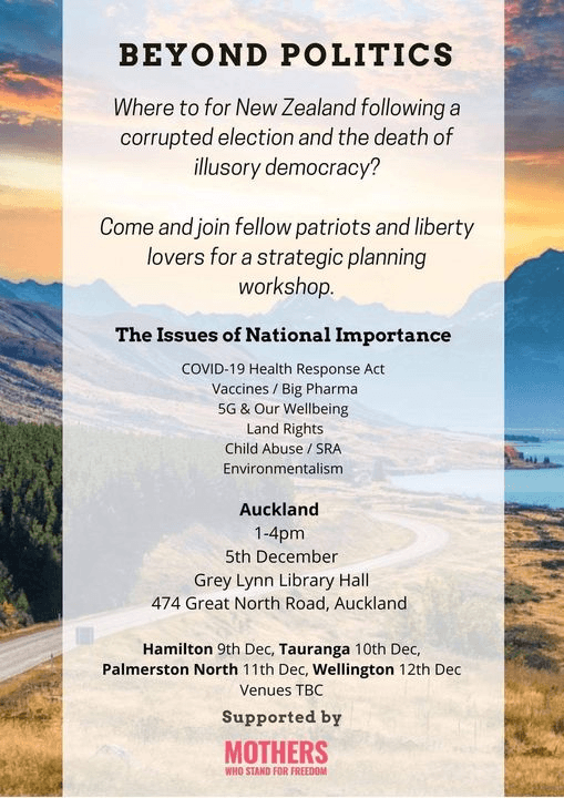 The gathering at the Grey Lynn Library Hall promises to take on a ‘corrupted election’, 5G, Covid-19 and ‘Satanic ritual abuse’.