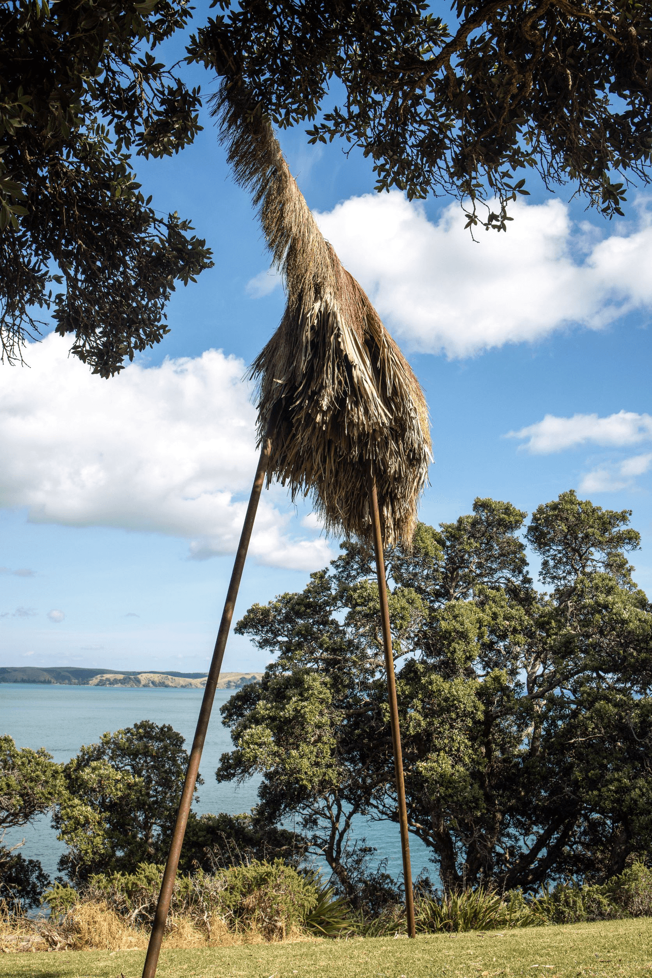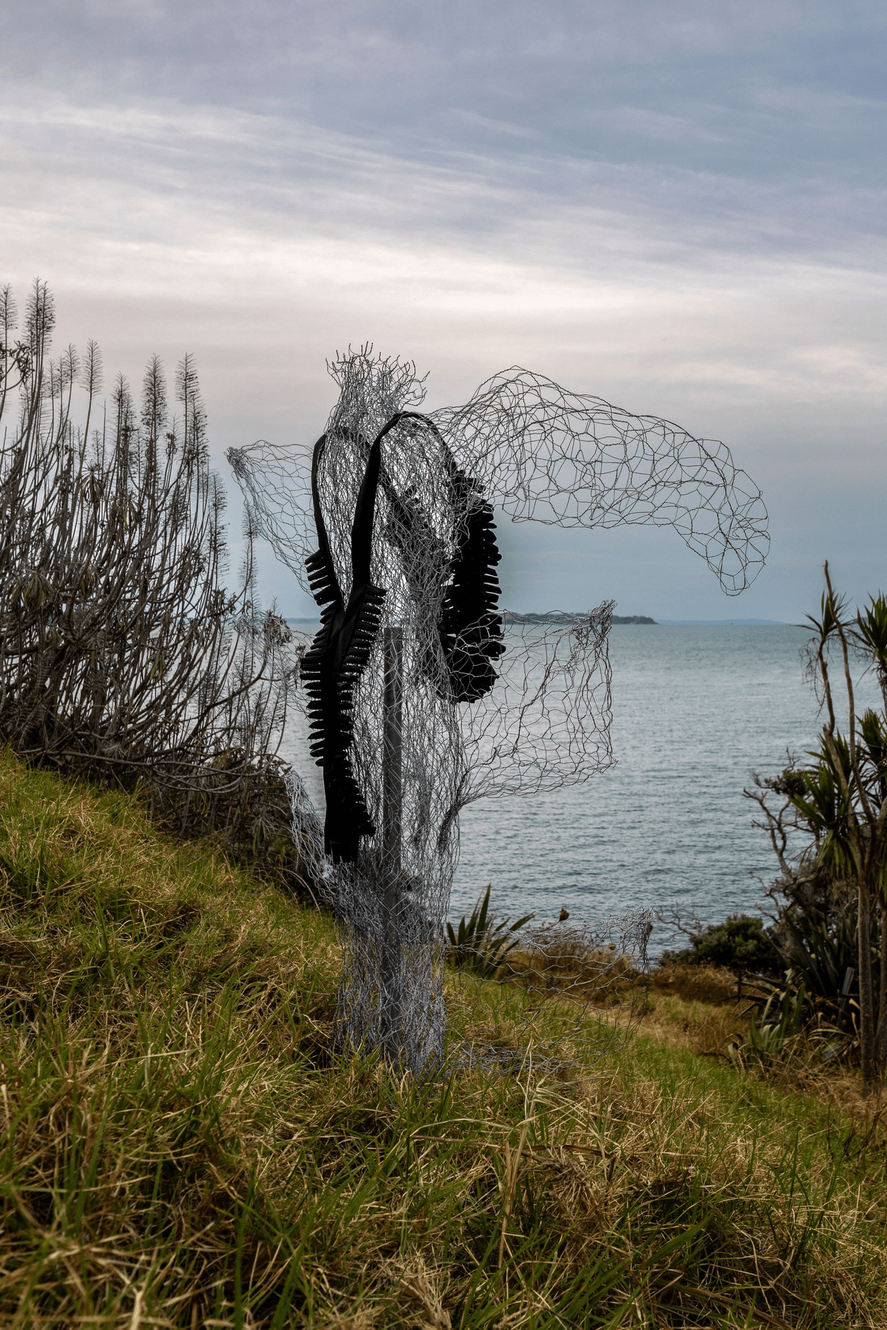 Further along the trail is Scarecrow, a collaboration between artists Salome Tanuvasa, who is of Tongan and Sāmoan descent, and Kazu Nakagawa, who was born in Japan but now lives on Waiheke. The work is part of Nakagawa’s ongoing series ‘Birds do not belong to the land’.