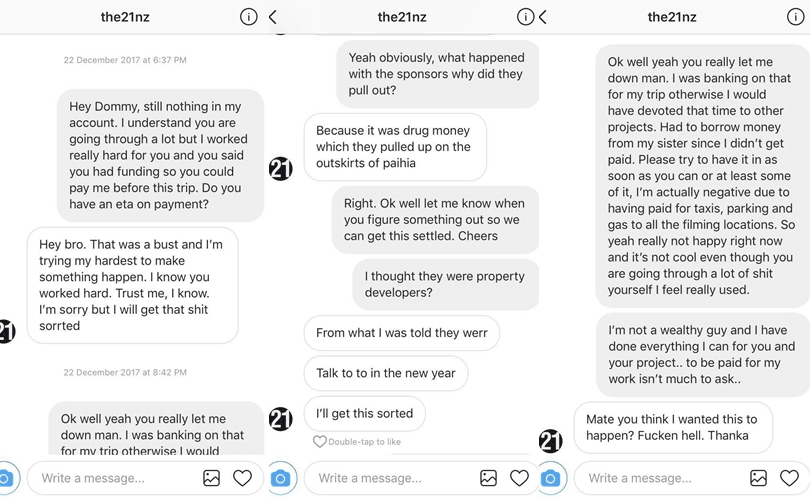 One of the people who came forward was The 21 NZ videographer Dan Wood whose studio NinetyOne Visual was commissioned to shoot the project. In total, Wood says he’s owed roughly $1,500 for his work and a further $700 for a camera lens he purchased with assurances he would be reimbursed for his costs.