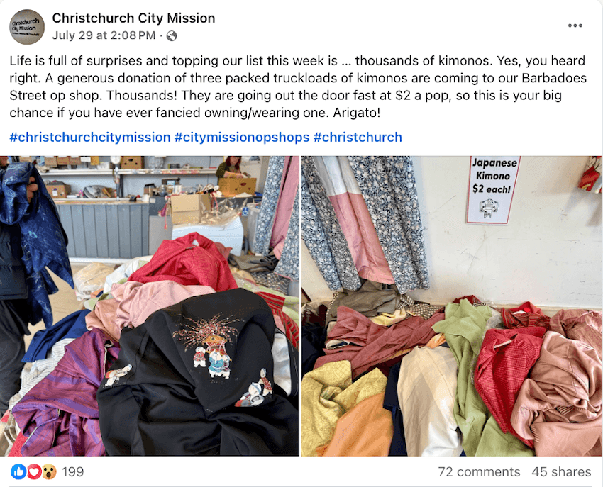Soon enough, the post had hundreds of comments and shares, with IRL queues forming out the door of both the Barbadoes Street and Sydenham City Mission stores. “It’s a kimono frenzy,” City Mission retail team leader Josie Cox told RNZ. “We’re selling them for $2 each and they’ve just gone mad. This morning there were probably 40 people waiting to come in.” The stock arrived by way of three trucks and two vans, and staff couldn’t restock the bins fast enough.