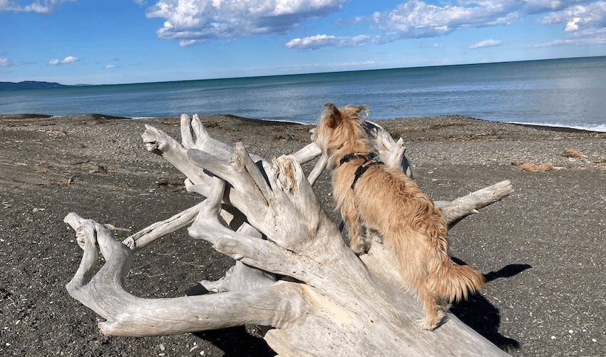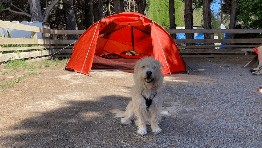 Even a dog with a head as remarkably large as Maggie’s can’t go camping just anywhere. There are 77 dog-friendly DOC campsites around the country, and plenty of useful listicles as a starting point. It always pays to ring ahead and double-check, so I was delighted when the woman from Leithfield Holiday Park, a beachside campsite 45 minutes north of Christchurch, confirmed they are still dog-friendly – provided the dog stays on lead and you “pick up after him” (dogs are boys, cats are girls).