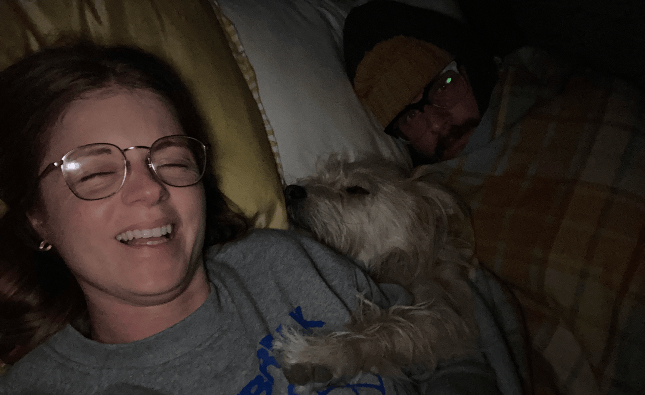 Soon enough, the rain was pelting our cheap tent as we huddled under sleeping bags and blankets. Instead of sleeping in her bed, Maggie had wedged herself firmly in the middle of us on the inflatable mattress, suddenly the size of an NBA player and firmly pushing us both off each side with every subtle stretch. Joe checked the weather – eight degrees but feels like five, heavy rain for the next few hours. “This is the worst thing you’ve ever done,” he said, pulling a beanie over his head.