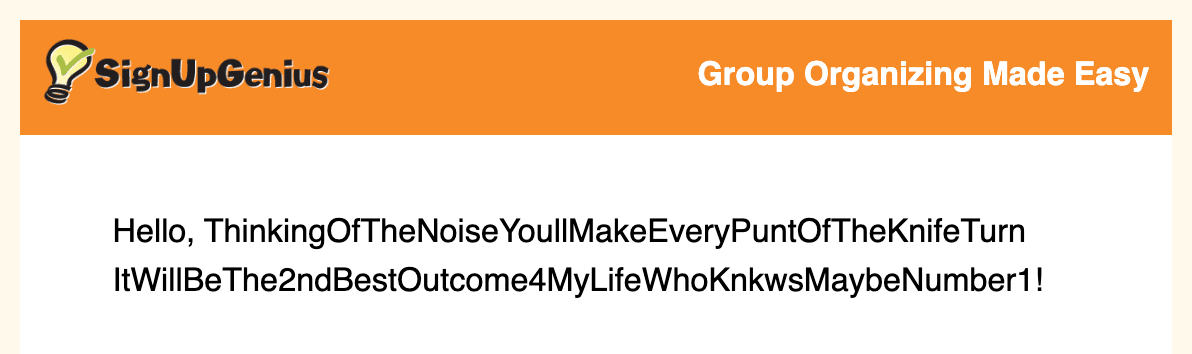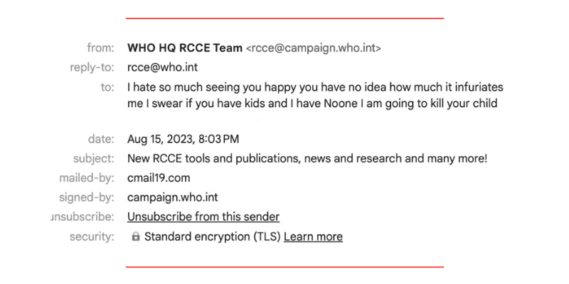 The emails were from dozens of different companies and organisations. Presumably to evade the legal prohibition on contacting me directly, Greg used my email address to sign me up for updates and subscriptions, and entered my contact details into the form sections of various company and NGO websites. Instead of inputting my name, Greg entered violent and humiliating messages to me, which would then show up in the automated greeting of the email.