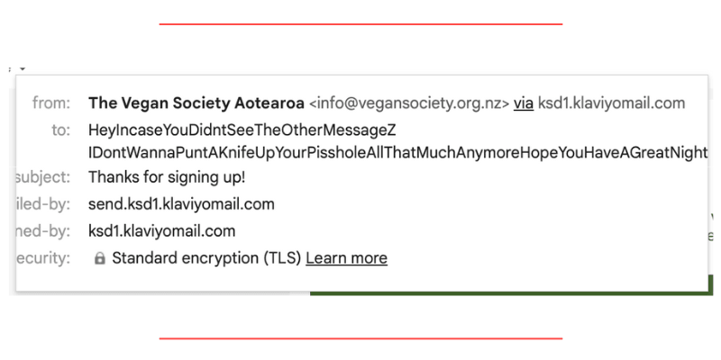 Meanwhile, the emails escalated. Some were relatively harmless but seemed calculated to remind me that Greg knew details about my life, including where I worked: he made dinner reservations under my name at several restaurants around Wellington; signed me up to donate blood and volunteer; emailed bands to request they play at my old workplace; signed me up for WOFs at various garages around the city (with sexually explicit notes in the “requested services” section); and emailed tattoo artists requesting ridiculous tattoos like a PETA tramp stamp (PETA is a vegan organisation; for some reason the fact that I’m vegan was often a focal point of Greg’s harassment.)
