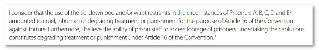Across 64 hours of observation, Ombudsman officers never saw ARU staff flex his limbs. Video footage showed an occasion when up to 14 officers crowded the cell to restrain him. The man was naked for two of the four observed restraints, and staff touched his genitalia so he could urinate into a bottle on the bed. The Ombudsman highlighted that these prolonged restraints and conditions were “degrading” and “dehumanising”. They clearly breached the UN’s Standard Minimum Rules for the Treatment of Prisoners as well as the 1984 Convention against Torture.