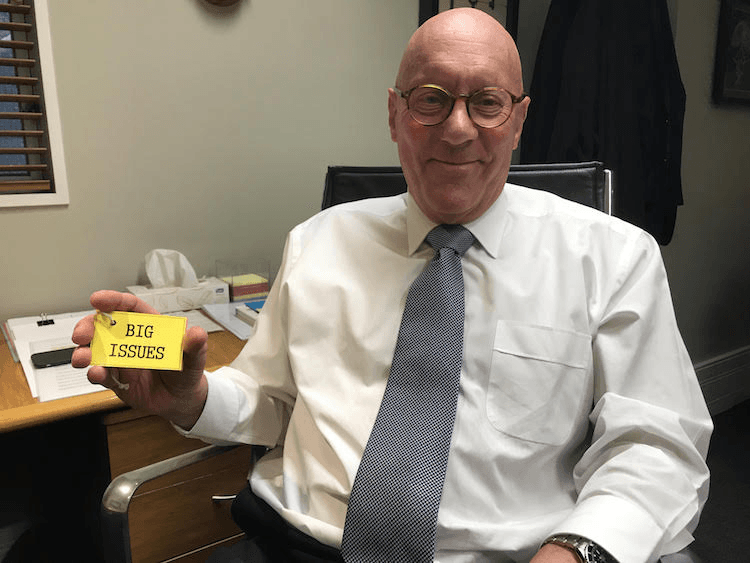 He shows me a stack of coloured laminated cards, tied together with brown, agricultural twine. The front card has “Big Issues” printed in a large font.