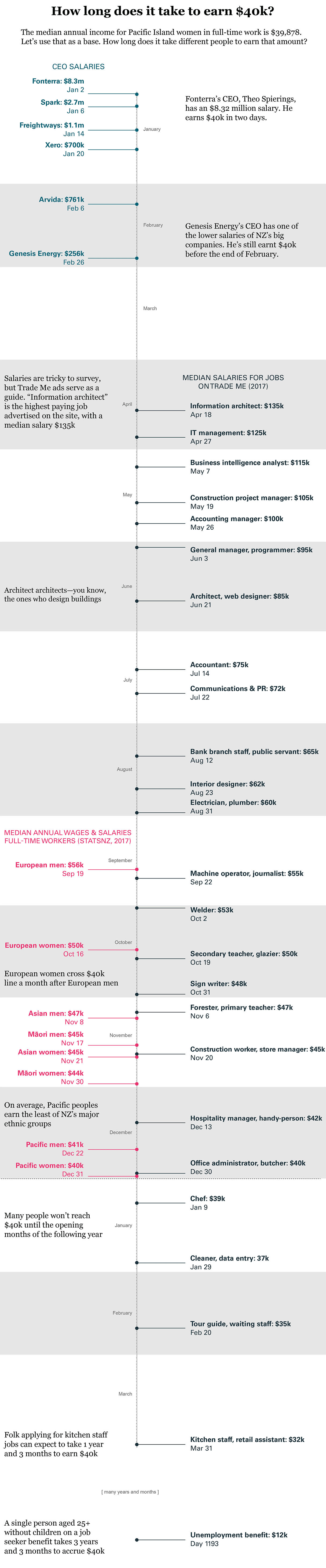 We hear a lot about the gender gap in wages, but what about other kinds of demographic disparities? Taking the median yearly wage of a Pacific Island woman as a baseline, Chris McDowall plots out a year in New Zealand salaries.