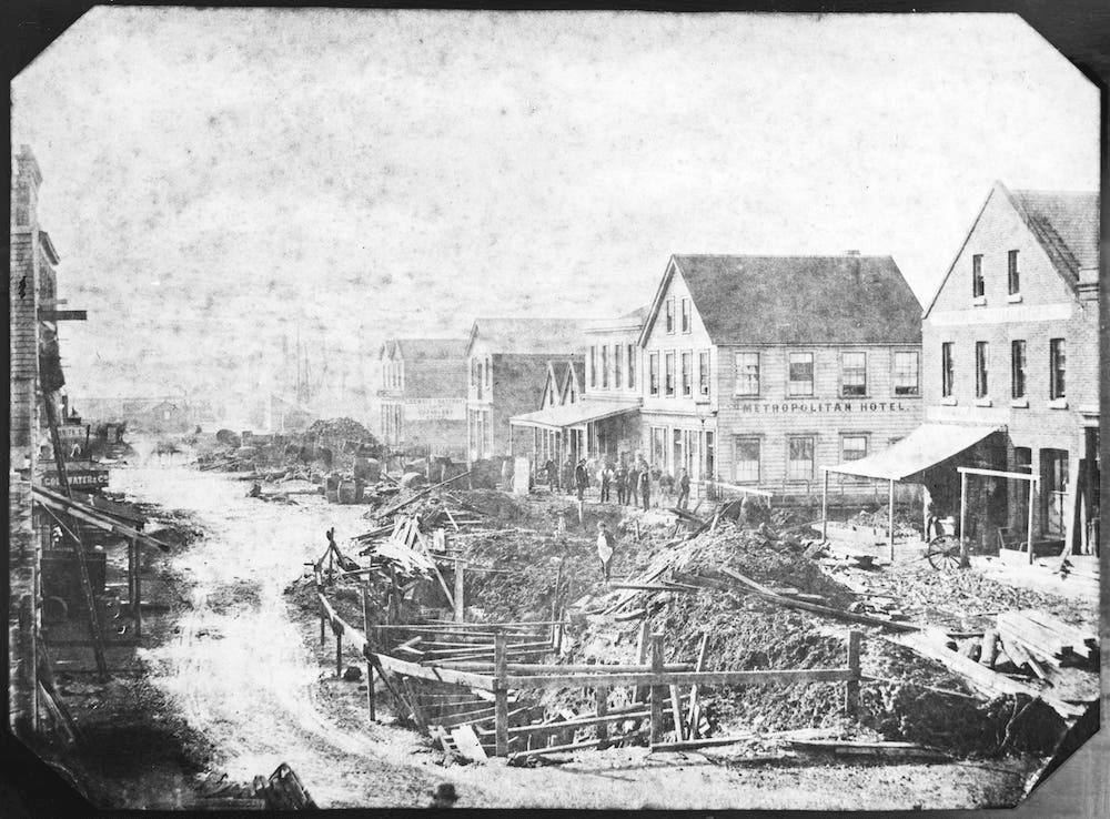 Normally, Queen Street is the centre of New Zealand’s commercial capital, but it looked more like a river while Auckland was pelted by record rainfall. That’s because the Queen Street valley used to be a natural water outlet into the Waitematā Harbour, with the Waihorotiu awa historically running down much of its course. From its source in what is now Myers Park, the Waihorotiu awa carved out the valley that Queen Street now inhabits, draining into the sea at the old foreshore on modern Fort Street. Kāinga were dotted around the banks of the awa, with their inhabitants sustained by its abundant fresh water supply and thriving fish stock.