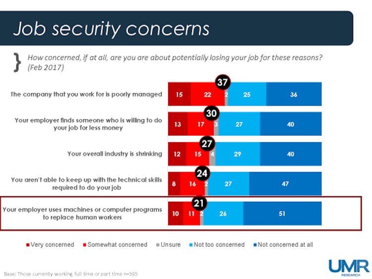 Provided with a set of reasons why people might worry about losing a job, 10% were ‘very concerned’ that their “employer uses machines or computer programs to replace human workers”; 11% were ‘somewhat concerned’; 26% were ‘not too concerned’ and 51% were ‘not concerned at all’; 2% were unsure.