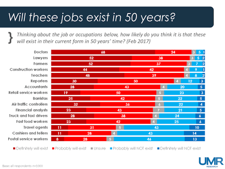 92% thought doctors would definitely or probably still exist, 90% lawyers, 89% farmers and 86% construction workers.
