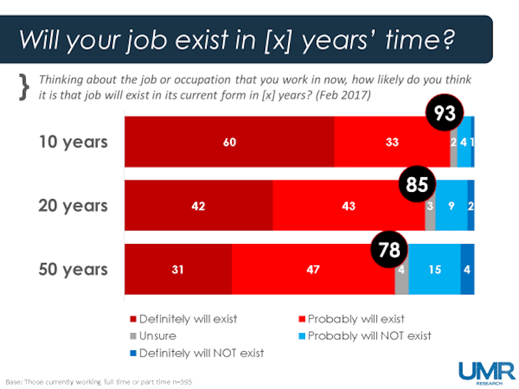 Decisive majorities of all New Zealanders surveyed believe that the job they work in now will be around in 10 years, 20 years and even in 50 years.