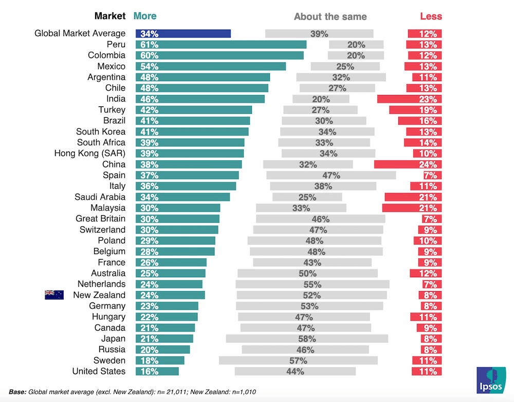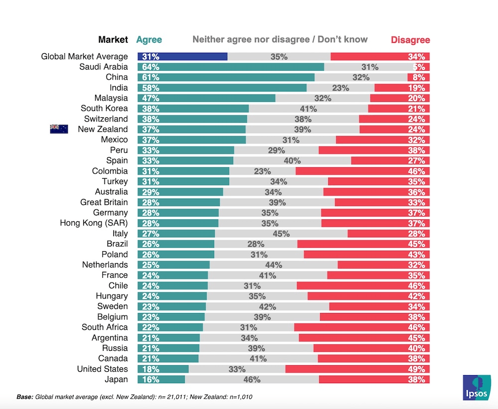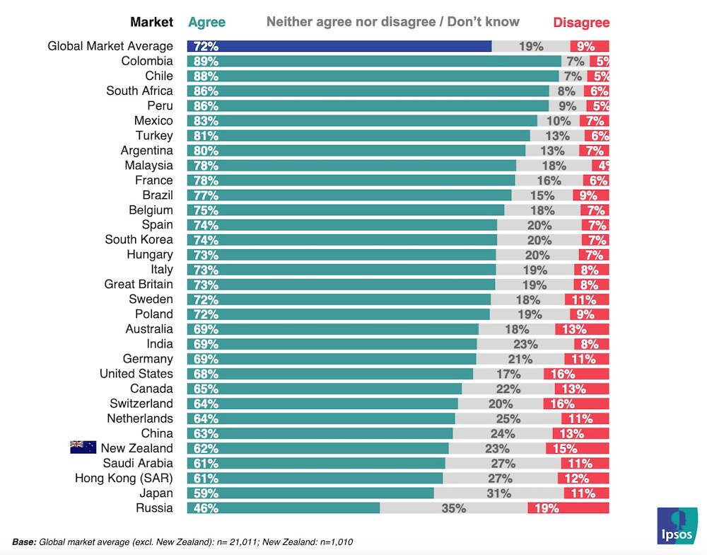When asked whether people would be failing future generations “if individuals like me do not act now to combat climate change”, we were near the bottom of the table with 62% agreeing with the statement, compared with 72% in other countries. In this category, New Zealand only showed greater concern than Saudi Arabia (61%), Hong Kong (61%), Japan (59%) and Russia (46%).