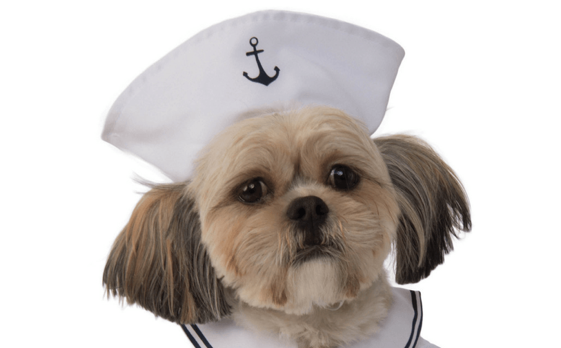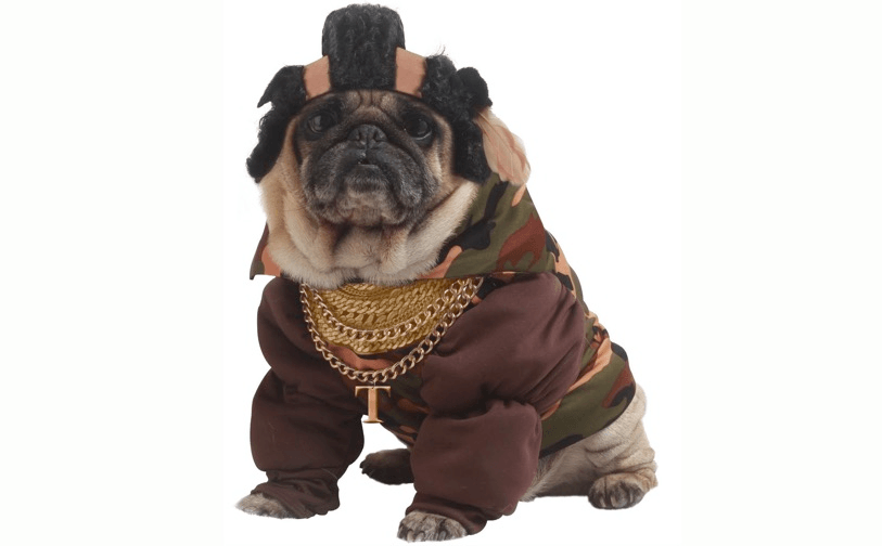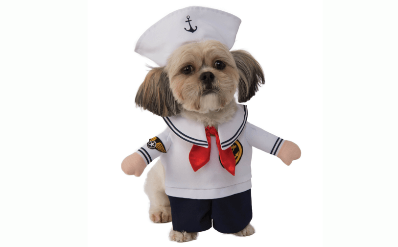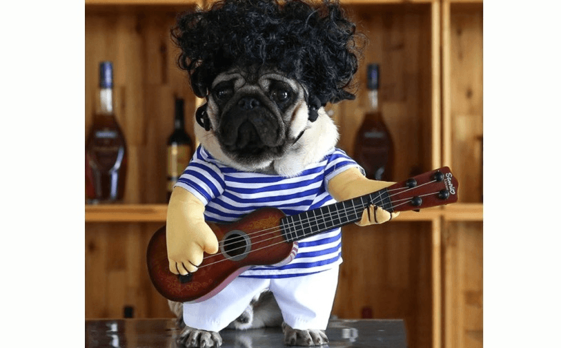 This costume provides us with an example of the great paradox of human/dog relations. If a person was to turn up on my doorstep wearing a stripy t-shirt and brandishing a cheap guitar with the intention of belting out some Jack Johnson, I’d put the hose on them. However, picture the same scenario with a forlorn wee pug dressed exactly the same, and I’d invite the poor thing inside for a sampler box.