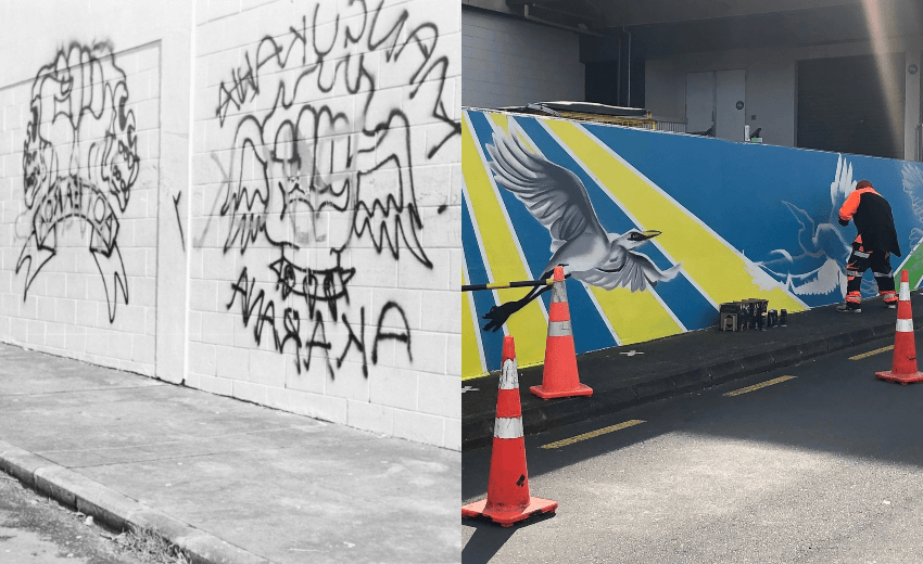 Twenty years on, Filipaina has swapped the patrol car for a normal sedan. But when he drives back from another long council meeting, instead of graffiti, he sees bus stops depicting tui in mid-flight, bright flowers blooming on a Chorus power cabinet and murals showcasing sporting legends like John Walker, David Tua and Jonah Lomu.