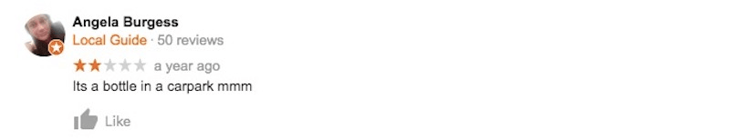 Scrolling further down, the Google reviews began to sour. “In real life it’s a lot smaller like the Leaning Tower of Pisa,” humblebragged Lyn. “Would have been a longer visit if it wasn’t for the torrential rain that day.” Poor Lyn. Three stars. “Its a bottle in a carpark mmm” wrote Angela ambiguously in her two star review. Alecia, who left only one star for the enormous bottle, was much clearer. “Just a big bottle that smells like wee,” she wrote, “srry”.