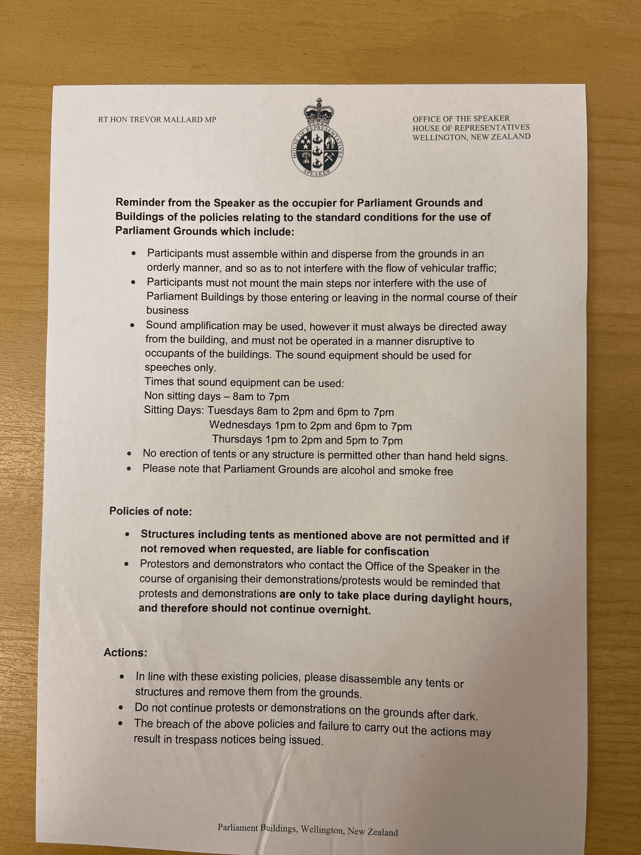 Yesterday afternoon a letter was distributed to protesters from the office of the Speaker of the House, Trevor Mallard. It provided a “reminder” of many of the activities that are in breach of rules for parliamentary grounds, including protesting after dark, pitching tents, and drinking alcohol or smoking, but was not a formal trespass notice.