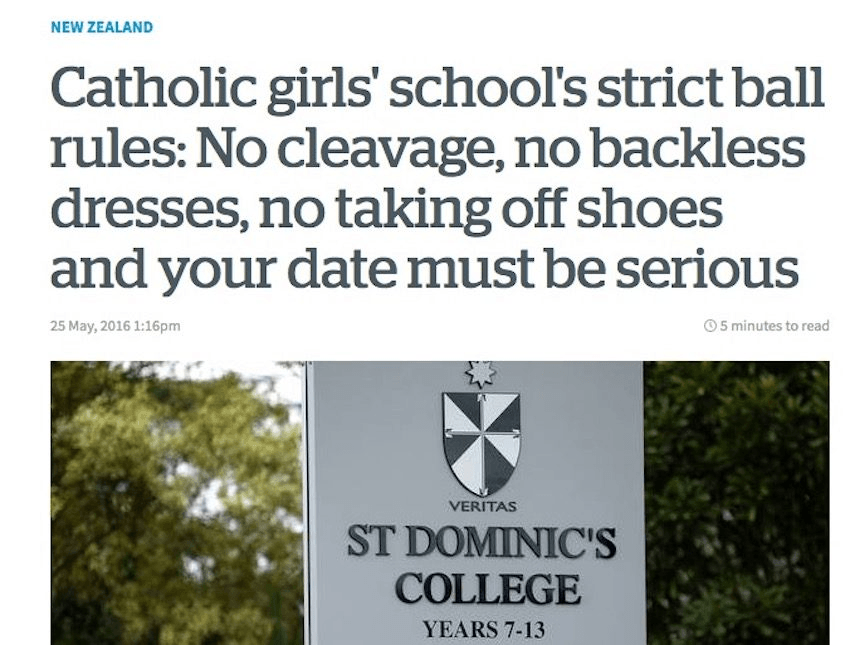 Everyone knows that human breasts are the devil’s pillows and must be locked away at all times. Why else would a British tourist have been asked by to cover up her “offensive” cleavage at a Christchurch casino in 2007? “She said I was wearing a low cut top that people found offensive, Helen Simpson told The Press at the time. “I was humiliated, absolutely humiliated.” If you thought that was a one-off, how about St Dominic’s Catholic Girls School, who stipulated in capital letters “there must be no cleavage AT ALL” in the rules for their school ball in 2016.