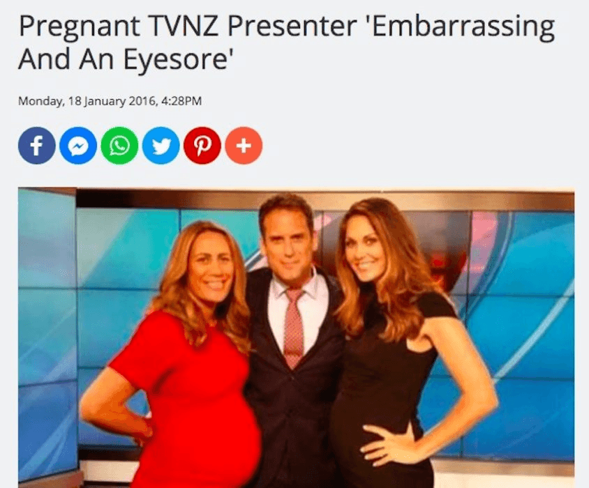 Never mind the fact that you are literally creating a new life inside your own body like an actual walking, talking miracle machine – being visibly pregnant in public is also not really OK. Take it from Jenny May Coffin, who was called “embarrassing and an eyesore” by extremely cool letter writer John Rook (Lower Hutt). “”Who is responsible for allowing a sports reporter in a very pregnant state to remain on screen?” he wrote in the TV Guide. “When a woman gets to that stage of pregnancy [show] a bit of decency – stand her down.”