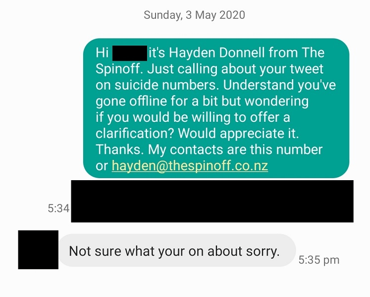 On Sunday, the Ministry of Health and the Mental Health Foundation issued statements that would’ve seemed weird to those not perennially online. “The Covid-19 response may have significant effects on people’s lives, but there is no truth to rumours circulating around suicide numbers. A significant increase in serious mental health issues or suicides is not inevitable if we all act now to support our mental wellbeing,” the Ministry of Health wrote. The Mental Health Foundation was more explicit. “There is no evidence New Zealand’s suicide rates have increased over lockdown. There is no truth to this rumour. It is irresponsible, dangerous and untrue,” it said.