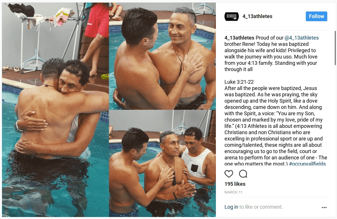 During the trial, a church group, 4:13 Athletes NZ, posted an image on its Instagram account of Naufahu and his family being baptised. In the caption, the church states that it is “Standing with you [Naufahu] through it all.” That is, instead of remaining neutral and performing the requested baptism privately, 4:13 Athletes chose to make a clear, public statement of support for Naufahu and publish a positive image of him on their social media.