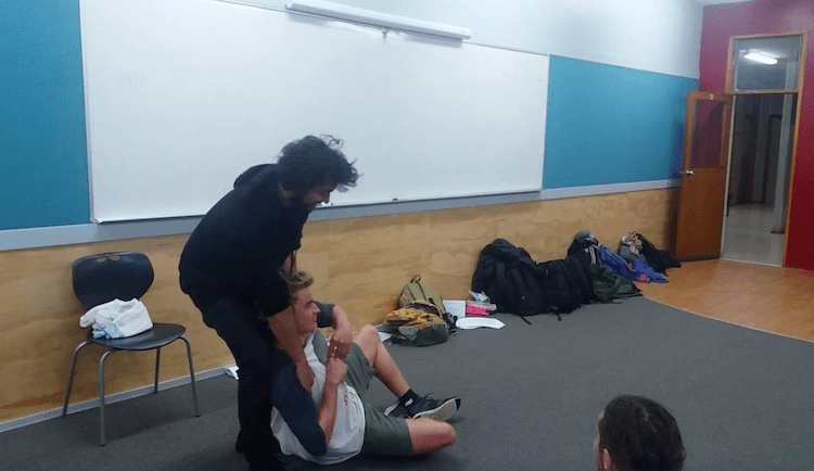 One simulation deals with this scenario, with Sam Murphy playing the role of someone looking to kick off. He wanders through the protest lines, muttering about wanting to “smash some pigs.” The other protesters try out various tactics to calm him down. When ‘police’ come back into the room, he leaps up, throwing wild theatrical haymakers before being wrestled to the ground. In his debrief afterwards, he praises those who tried to de-escalate the situation, “but I did still manage to punch seven cops, which is not good.” Protesters who get violent endanger everyone else on the blockade.