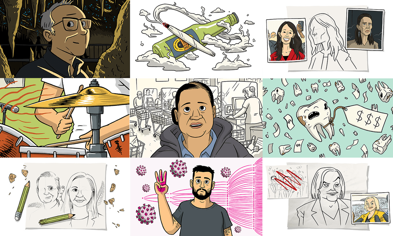 From a dentist’s office to a glow-worm cave to an Auckland recording studio, Toby Morris’s monthly comic The Side Eye has been everywhere in 2020. To mark a historic year, we’re launching the first edition of The Side Eye Annual, a printed collection of Morris’s Side Eye comics published on The Spinoff this year.