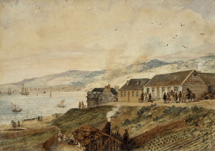 During those four nights, he stayed at the home of Reverend Robert Cole, “whose premises were immediately filled by a crowd of Māori attendants on the chief”. Robert Cole was the pastor at the first St Paul’s Church. There is a plaque marking the site of the original church on parliament grounds, just behind the Beehive. The pastor’s house was located near the church. I couldn’t find an exact address, but it is shown in a painting by Samuel Brees on a hill above The Terrace, probably on Bolton Street. If Te Rauparaha and his 50 warriors needed food or drink during their stay, they could have walked 350 metres to The Thistle Inn.