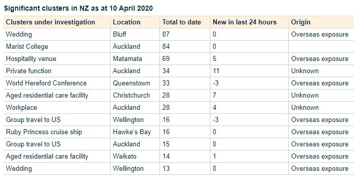 There remain 12 “significant clusters”. The three largest clusters remain to be Matamata, which now has 69 cases, an increase of 5 from yesterday; Bluff, 87, unchanged from yesterday; and Marist College, Auckland, 84, also unchanged.
