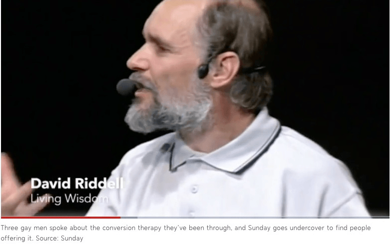 In 2018, Living Wisdom’s practices were the subject of an undercover investigation by TVNZ’s Sunday programme. Riddell dismisses the story, titled “Pray the Gay Away”, as a “witch hunt”. He insists that his anti-homosexuality counselling does not amount to conversion therapy.