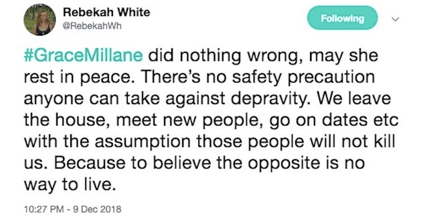One of the flow-on effects of this tragedy is that even though it was not Grace who was at fault for travelling alone or meeting a stranger on a dating app, many women will now be wary of doing the same.