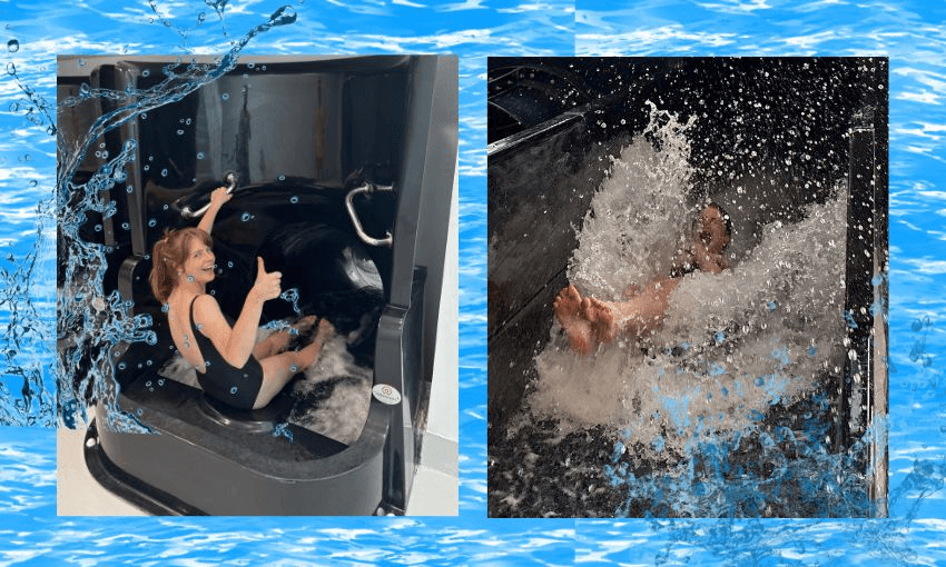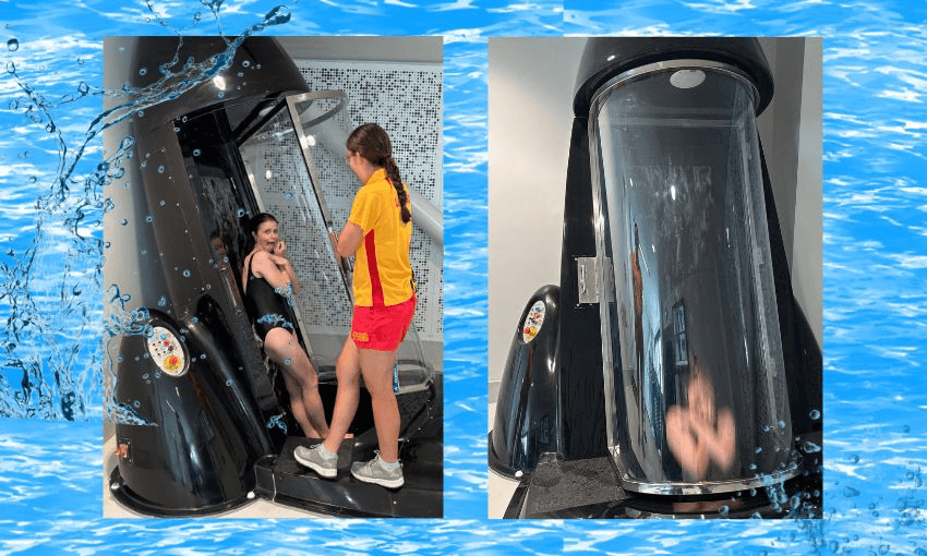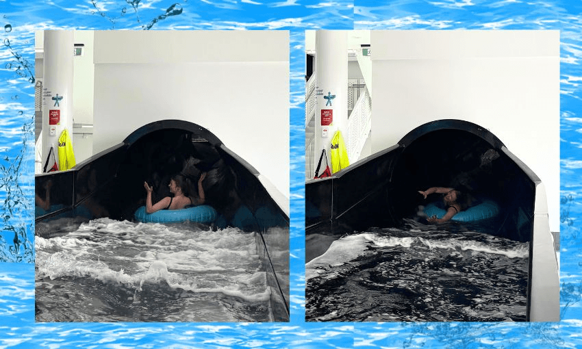 On that note, it was time for the most fearless news outlets, aka The Spinoff and The Press, to test out the hydroslides for themselves. Had I anticipated the awkwardness of swanning about in togs in a room full of fully-clothed professionals? Of course not. The Press’s Elsie Williams was savvier than I, opting for leggings and a singlet. When I am dead, please remember this: I was the only journalist in the country brave enough to get their flat pancake ass out the day the biggest indoor aquatic centre in the Southern Hemisphere opened.