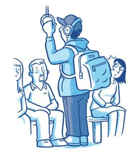 Jay’s got a bag full of textbooks and his head in an essay that’s due on Wednesday morning that he hasn’t started. Well, he hasn’t started started, but he has started thinking about it. He’s doing it right now. He’s standing in the aisle and – what was that? – he turns sharply and smacks that bag right into your head. He’s got headphones on so he doesn’t hear you protest. He smacks you again. He’s gonna get a B+ this time, at least.