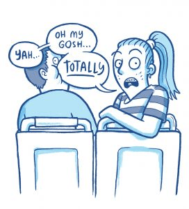 The multi-row chat trap is a common one – groups of teens who get on and take a row each when everyone knows all the seats will be full in two more stops. Three kids take six seats. Four kids take eight seats. It’s madness, Stacey, madness. And then when you fall into their trap and sit in between them, they’ll keep talking through you like you’re not even there. Like you’re a piece of wet Glad Wrap stuck to a chicken wire fence in the wind, little pieces of egg sandwich still smeared on it. Stink move Stacey.