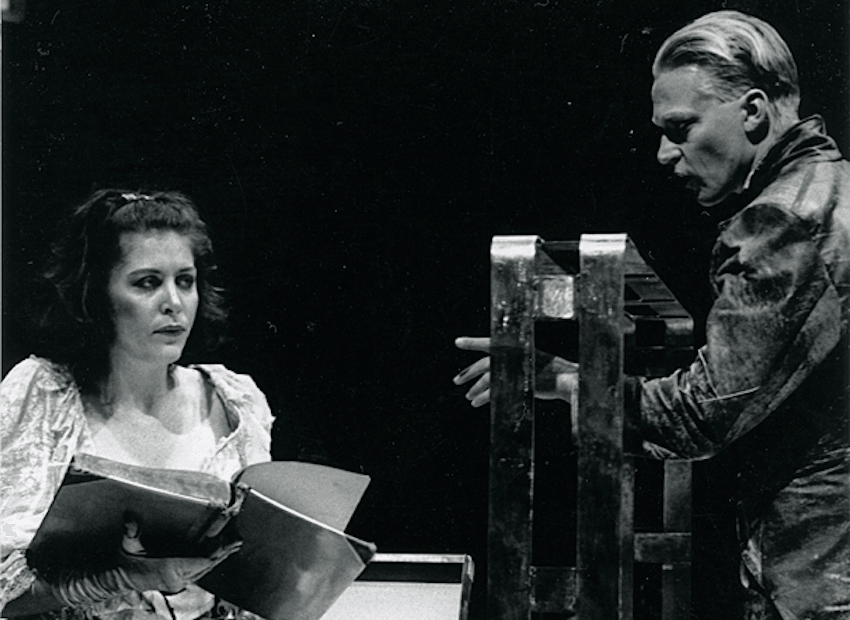The second time was at Downstage. I seem to remember we had carcasses hanging down. I had a corset over the top of this kind of grey suit, and you could see the steel bones on the outsides. I seem to remember metal and hard clangy things, things on hooks. It was industrial – that’s the word I’m looking for, an industrial production. A lot of fun.