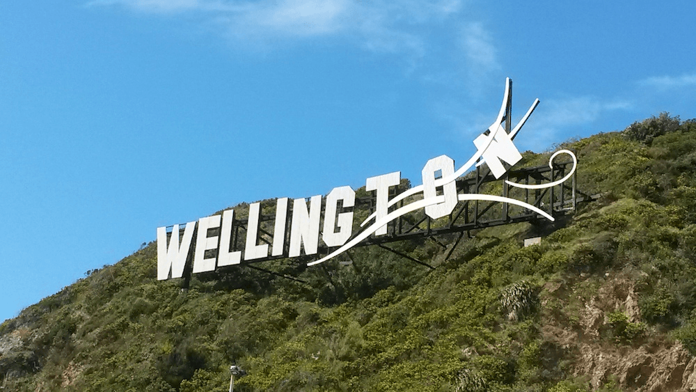 The sign, also known as “Wellington blown away”, measures roughly 28 metres across with letters that are around 3.5 metres high. The structure, designed by Matt Sellars and Raymond McKay and inspired by the city’s blustery weather, was installed on the Miramar cutting near the airport in 2012 at a cost of $80,000. It belongs to Wellington Airport, a joint venture between infrastructure investor Infratil and the Wellington City Council.