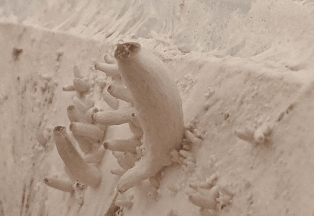 He went about some investigations online, and found a method to follow. He collected spores from the mushrooms and put what was left of the kit – a hunk of wood chips held together with a “bungee cord-like cotton candy” web of mycelium – into the worm farm. Mycelium is the colony of thread-like fungi from which mushrooms fruit as the reproduction mechanism. Then he mixed the spores into a slurry with sugar and water, let it incubate for a few weeks and “essentially infected a bunch of what’s called grains”. Grains are a substrate for mushrooms to grow, but we don’t need to worry about that because it went terribly. A lot of things grew, but most of them were not grey oyster mushrooms.