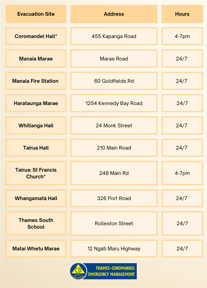 Official evacuation centres will open in the Thames Coromandel district at 4pm on Sunday and are available at the following locations:
