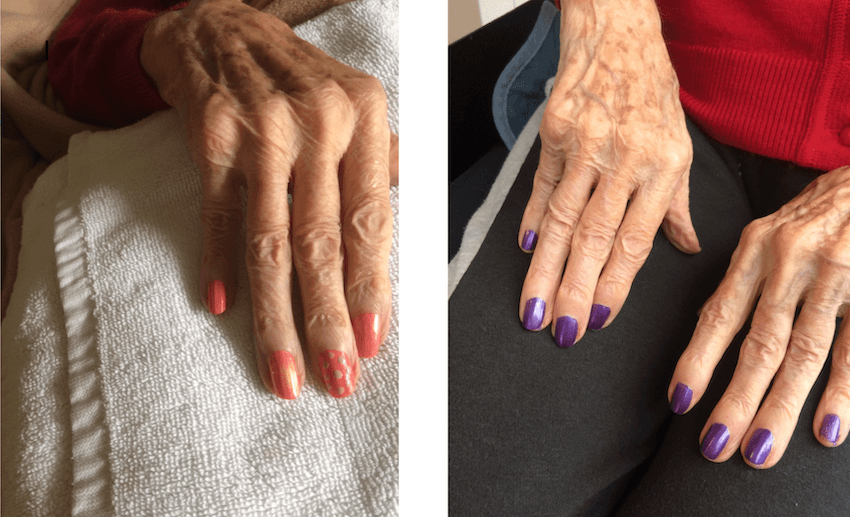 A Kardashian-esque muted pink I bought as a present when she was in hospital is my grandma’s staple nail polish these days. We break it up every now and then with a hot pink, a washed-out yellow, one time an experimental attempt at polka dots, and on our last visit we ended our weekly date with matching sparkling purple manicures.
