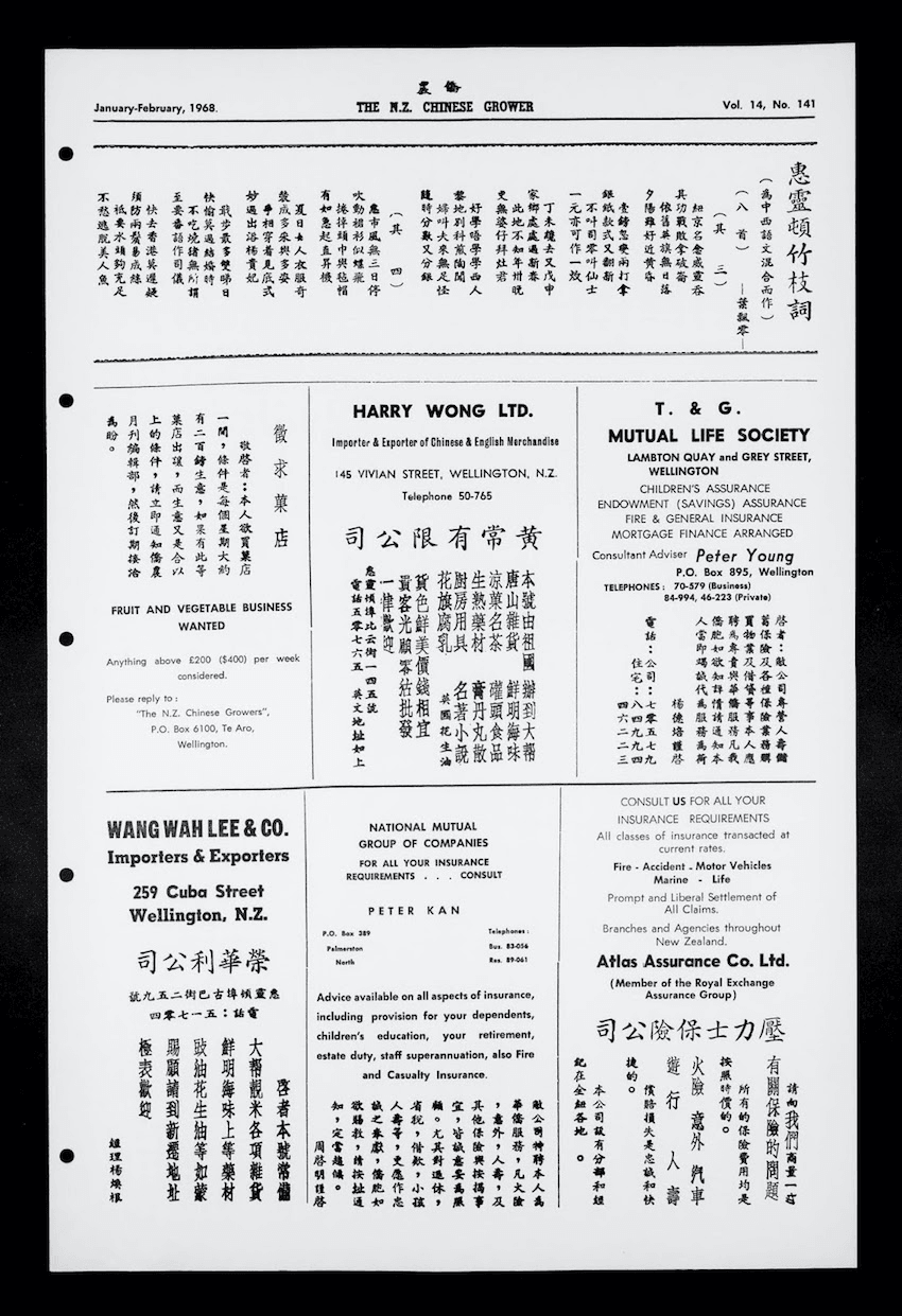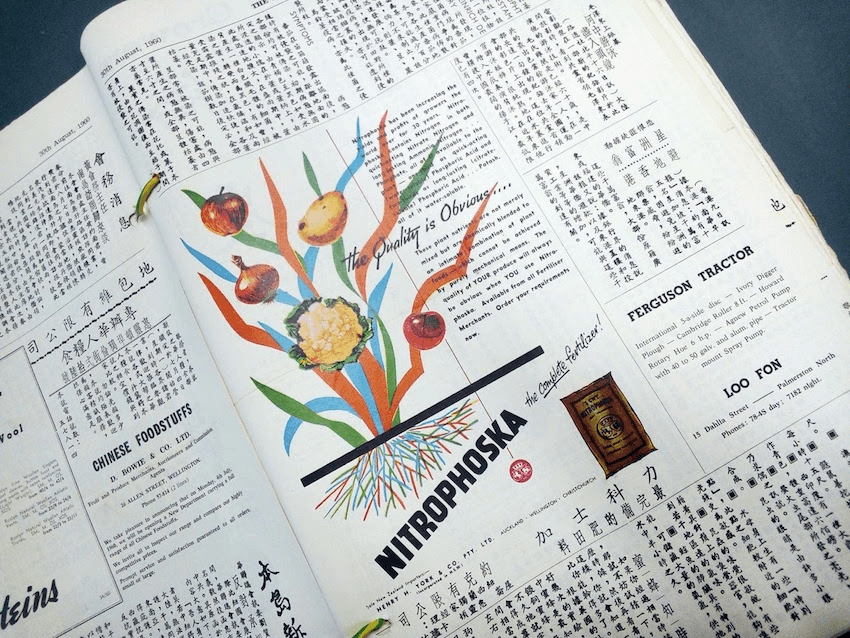 The Journal was published locally in Wellington. The photograph of editor Lionel Chan (Chan Lai Hung 陳賴洪) sitting at his office desk was taken above the produce auction warehouses on Blair Street. Lionel’s children Ting and Danny were brought in to do typesetting. In its final years, the letterpress composition room moved to Lionel’s home in Newtown. The Journal served county associations (Seyip, Tung Jung and Poon Fah) and church groups who would promote their meetings and events. Lots of Wellington CBD-based businesses advertised, including importers and exporters of Chinese foodstuffs, dry goods, medicine and books. It also promoted financial services, banks, insurance and travel agents — Chinese businesses wanting to reach out to Chinese clientele.