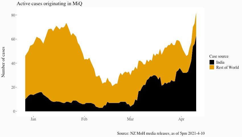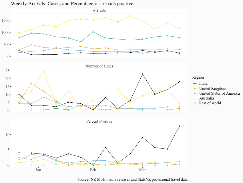 According to the provisional travel data from StatsNZ, at the beginning of the year more people were returning to New Zealand from the US and UK than from India. Despite this, the positivity rate for all three countries was around 5% and within our quarantine capacity. Since then, the positivity rate for travellers from the UK and US has dropped, but from India it’s been rising and is now at over 10%. As India’s case count continues to rise exponentially, it’s not unreasonable to think imagine that the positivity rate will also continue to increase. Given we normally have several hundred people arriving from India every week, this is how we could end up overwhelming our current capacity to isolate and care for everyone arriving with the virus.